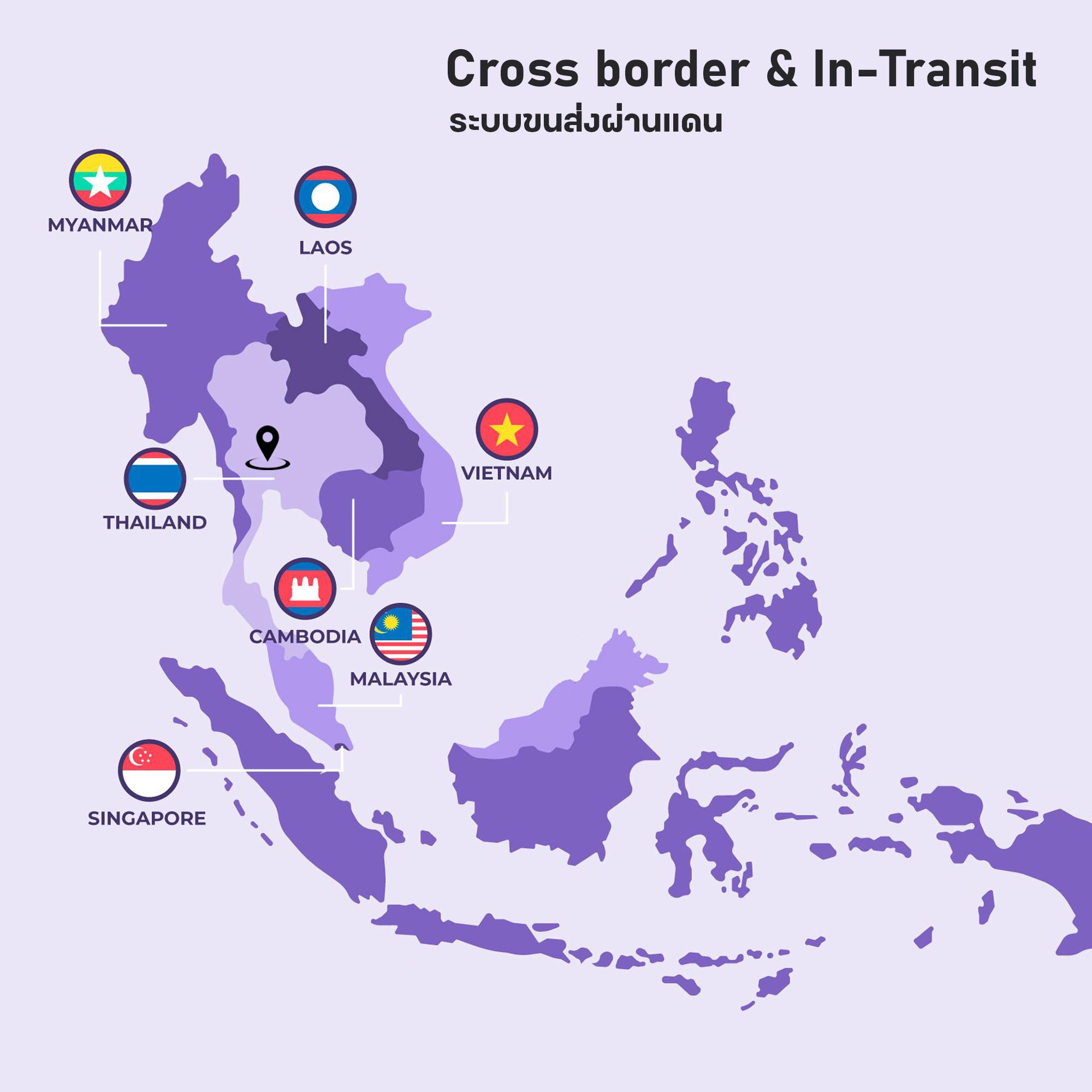 บริการดำเนินการสินค้าผ่านแดน นำเข้า/ส่งออก จากต่างประเทศไปยังประเทศที่ 3 ได้แก่ ประเทศ ลาว พม่า กัมพูชา มาเลเซีย สิงคโปร์ และเวียดนาม โดยให้บริการอย่างครบวงจรตั้งแต่การดำเนินการด้านพิธีการศุลกากรทั้งหมดไปจนถึงการส่งสินค้าให้ถึงมือลูกค้าอย่างปลอดภัย ด้วยทีมงานที่มีประสิทธิภาพ มีความเชี่ยวชาญสูง.